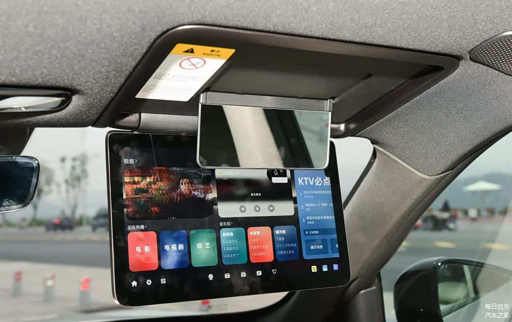 这台车非常有特色的配置是副驾屏位于遮阳板位置,屏幕尺寸为12.8英寸,角度可以调节,副驾驶与后排乘客都可以观看。化妆镜位于屏幕下方,需要使用时必须先打开屏幕。
