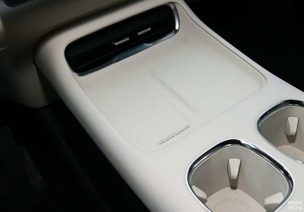 中央出风口并非面朝顶部,可防止小物体掉落。双手机位置左侧提供无线充电和通风散热,中央有双独立杯架。