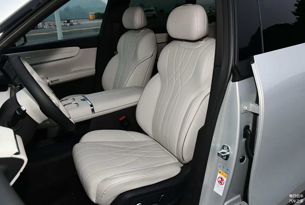座椅皮面柔软,填充物有弹性,提供很好的贴合感。前排座椅都提供加热、通风、按摩和记忆功能。副驾座还能实现零重力坐姿,靠背最大仰角150度还带电动腿托,可躺平看大屏。