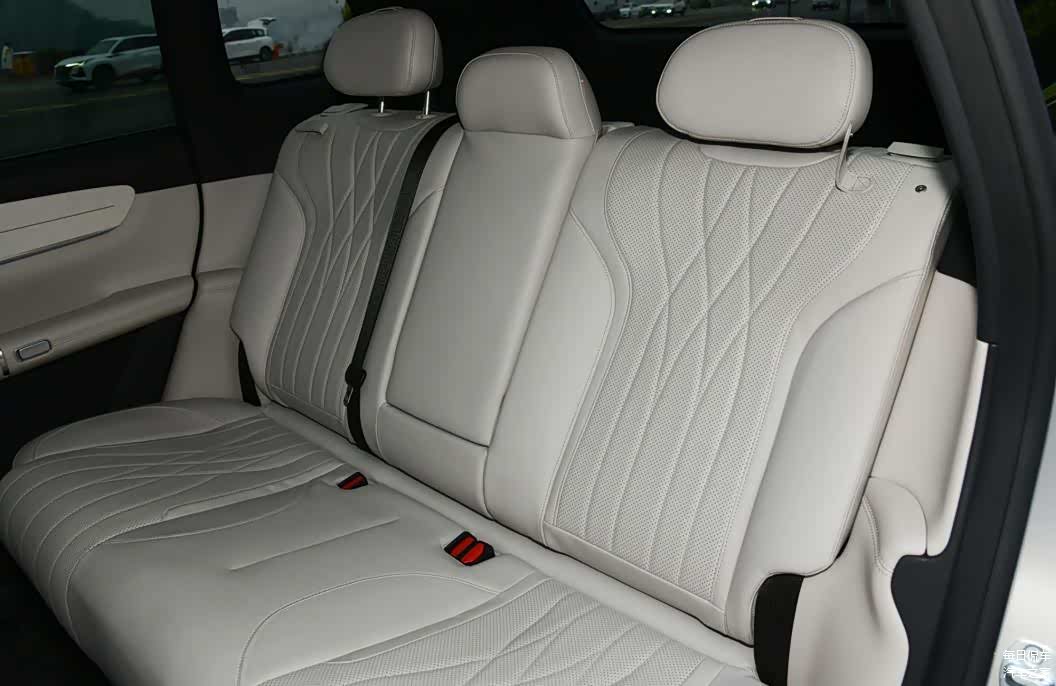 后排座椅空间十分充裕,即使身高190cm的高个儿乘坐也不会拘束。后排座椅靠背可电动调节,带来不同坐姿,还支持通风和加热功能。