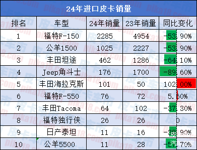 近日,2024年国内进口皮卡销量曝光,共计售出4263台,相比2023年的10507台下跌近60%,其中原因一方面是国产皮卡的迅速崛起,例如长城山海炮,江铃大道敢探者等车型已完美符合了进口皮卡“平替”需求,另一方面也是由于当前对于皮卡的众多限制性政策以及乘用车领域的内卷加剧。