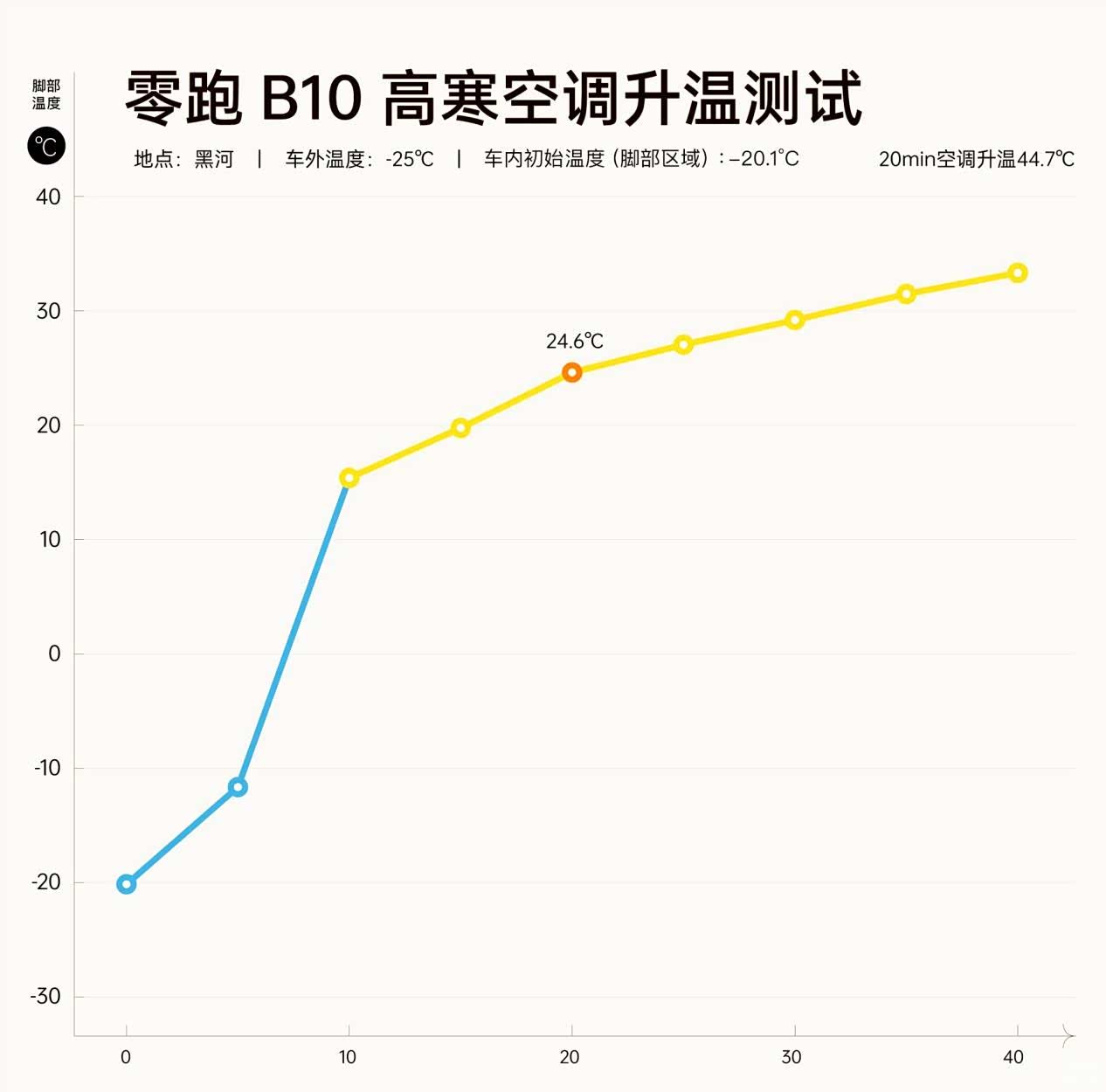 把车辆在户外静置12小时之后,车内的温度只有-20.1度,如果不提前打开空调制热,那开车简直犹如受刑。通常情况下来说,在极寒天气下,纯电车型因为没有发动机的缘故,车辆的制热效果并不理想,空调制热过程也会更慢。但零跑B10只花了20分钟,温度就从-20.1度提升到了44.6度,要知道,很多燃油车都很难在这个时间内做到这么快的升温速度。