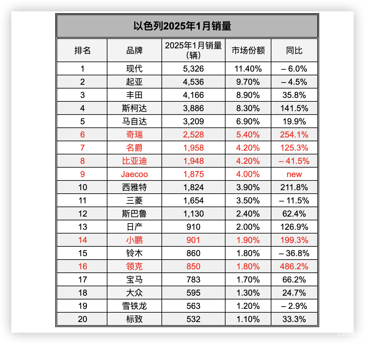 中国汽车品牌进一步强势。虽然还没有到达第一梯队,但是前十榜单中,已经出现了四个中国品牌。1月份排名最高的是奇瑞。以2528辆的销量占在第六的位置,排名比12月下跌1级。同比增长254.1%。和去年同期相比,销量翻了超过2倍。奇瑞子品牌表现亮眼。登陆以色列市场还不到1年,就以1875辆的销量排在第9的位置跻身前十榜单。排名比12月上升20级,坐上了直升飞机。