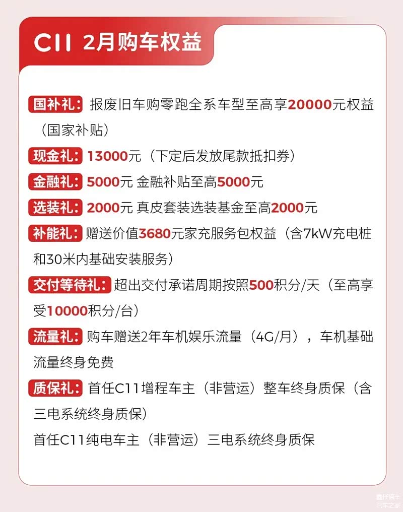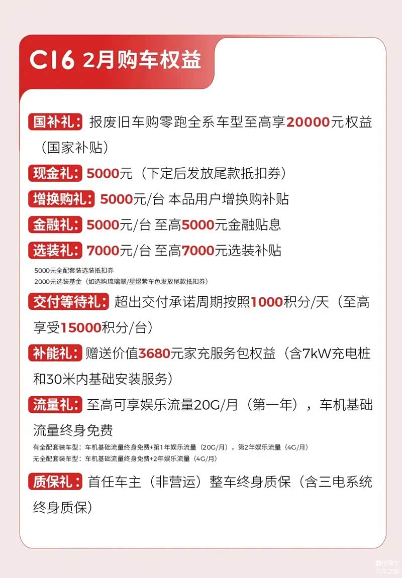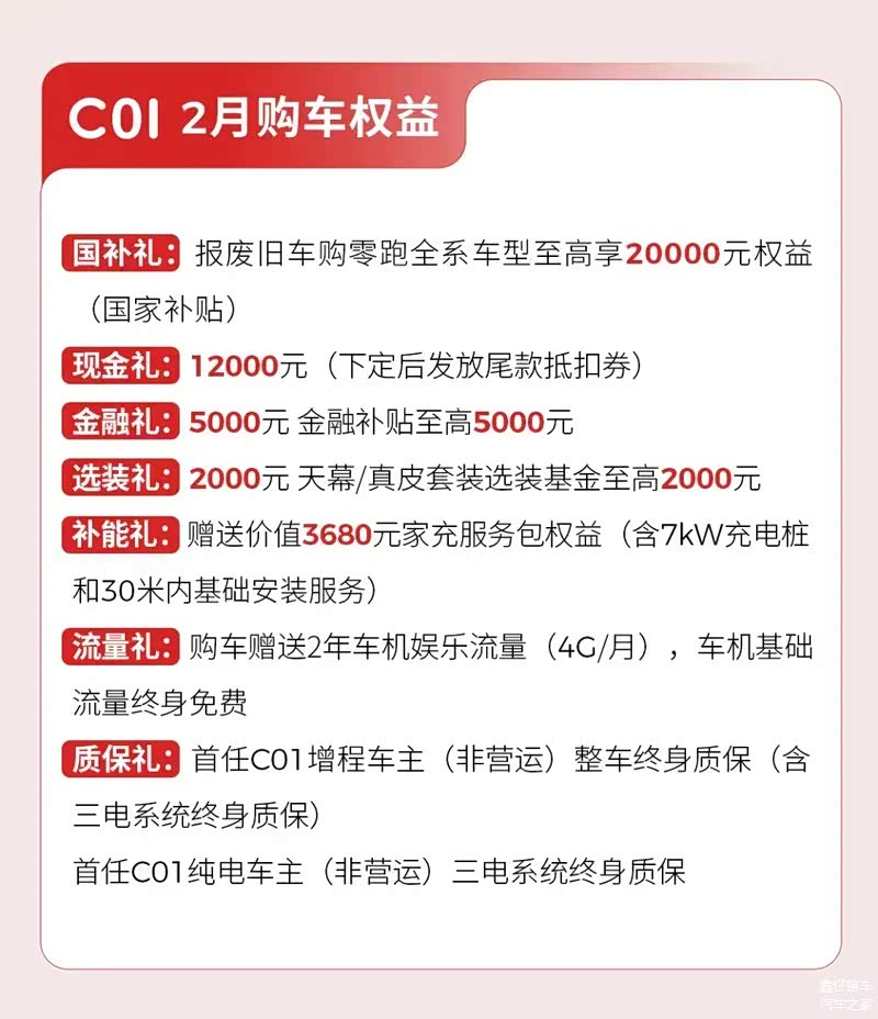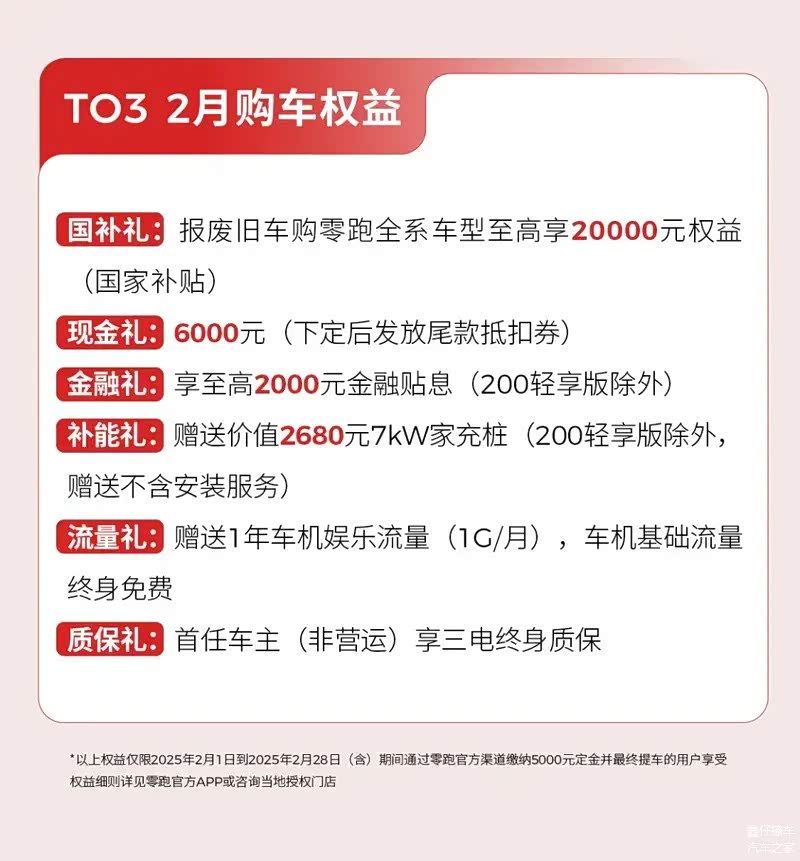 2月初,零跑汽车推出最新购车优惠,即时起至2025年2月28日,C系列限时补贴后售9.38万元起。以上权益仅限2025年2月1日到2025年2月28日(含)期间,通过零跑官方渠道缴纳5000元定金并最终提车的用户享受。