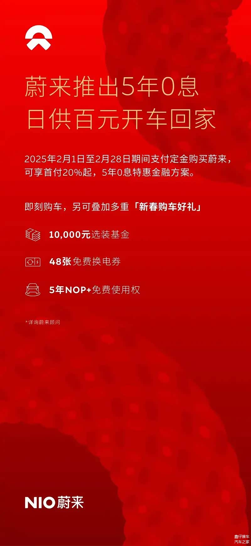 2月1日,蔚来宣布推出限时特惠金融方案,2025年2月1日至2月28日期间支付定金购买蔚来可享首付20%起,5年0息(蔚来ET9除外)。