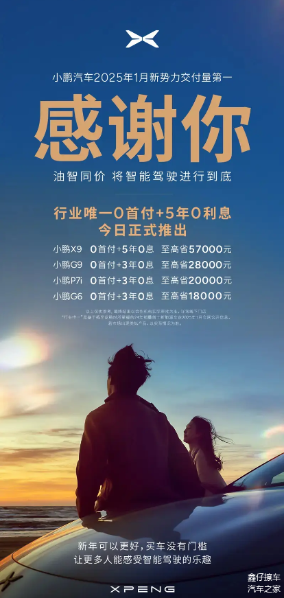 2月5日,小鹏汽车宣布推出行业唯一“五年0息0首付”政策。此次免息购车政策覆盖小鹏X9 、小鹏G9、小鹏P7i以及小鹏G6多款车型。