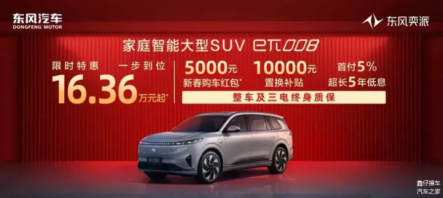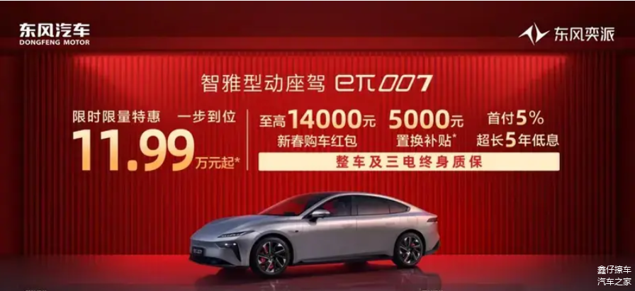 2月5日,东风奕派宣布旗下eπ007和eπ008推出限时优惠,其中东风奕派eπ007特惠后限时到手价11.99万元起,东风奕派eπ008特惠后限时到手价16.36万元起。