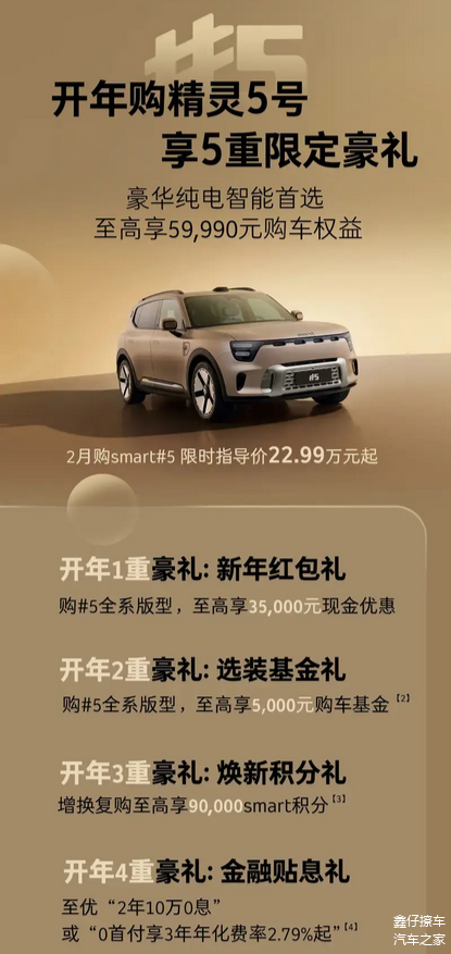 smart精灵#5发布2月限时指导价22.99万元起,并可享受至高3.5万元现金优惠的新年红包礼、至高5000元购车基金的选装基金礼、增换复购至高9万smart积分的焕新积分礼、至优2年10万0息或0首付享3年年化费率2.79%起的金融贴息礼、以及多重新年进阶礼。