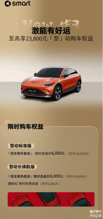 smart精灵#3型动标准版可享密友挚热套装限时选装价6000元;型动长续航版可享密友挚热套装限时选装价6000元,以及镭射红限时免费选装;型动四驱版可享密友超拉风套装限时选装价6000元,星尘蓝颜色限时选装价5000元,以及20英寸星联五辐轮毂限时选装价5000元。