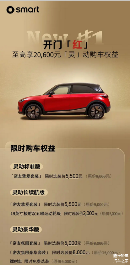 具体来看,smart精灵#1灵动标准版可享密友挚爱套装限时选装价5500元;灵动长续航版可享密友挚爱套装限时选装价5500元,19英寸棱射双五辐运动轮毂限时选装价2000元;灵动豪华版可享密友氛围套装限时选装价5000元,密友氛围豪华套装限时选装价8000元,以及镭射红限时免费选装。