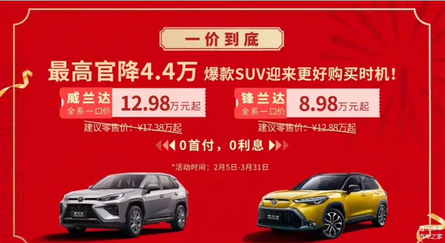 2月5日,广汽丰田宣布推出一口价暨终身质保。针对爆款车型威兰达和锋兰达实施“一口价”,厂家指导价降幅最高达4.4万元,并提供“三大核心部件终身质保”权益。