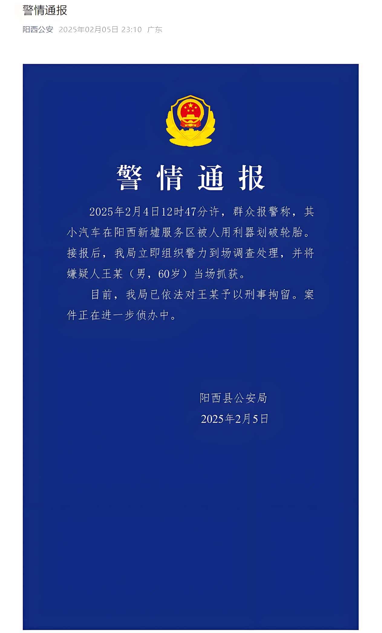 目前,阳西县公安局已依法对该男子刑事拘留,案件正在进一步侦办中。