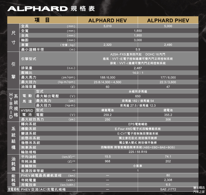埃尔法 PHEV 采插电式混合动力,搭载 18.1kWh 容量的高效能动力电池,电池配置靠近底盘位置,可有效降低车辆重心,也提升行驶稳定性,NEDC 测试的纯电续航为 80 公里,最大综合马力达 306ps,平均油耗可达 74.1km/l,支持 SAE J1772 的 AC 交流电规格。