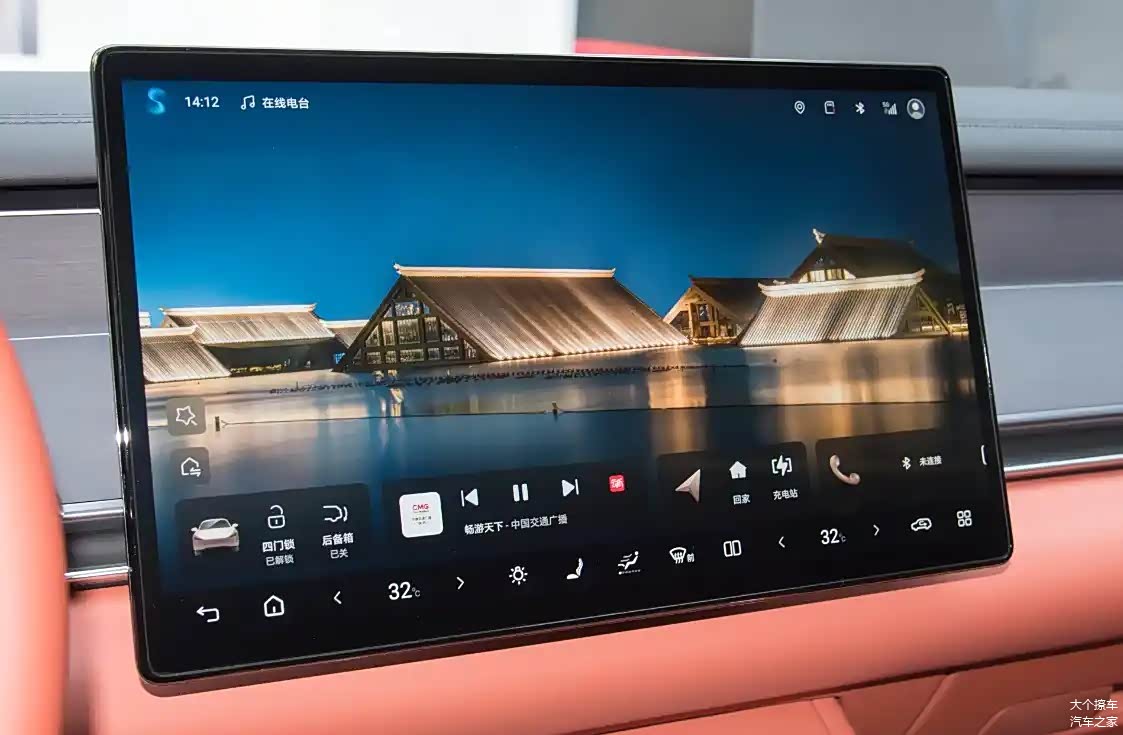 车辆的内部装饰依然采用了悬浮式中控屏幕与液晶仪表的组合方式,同时中央岛台区域也保留了若干物理按键,以便于日常功能的操作和使用。在设备配置方面,我们还会提供车内的冷暖冰箱、香氛系统,以及前排手机的无线充电功能和丹拿音响等多项功能。