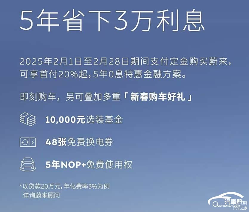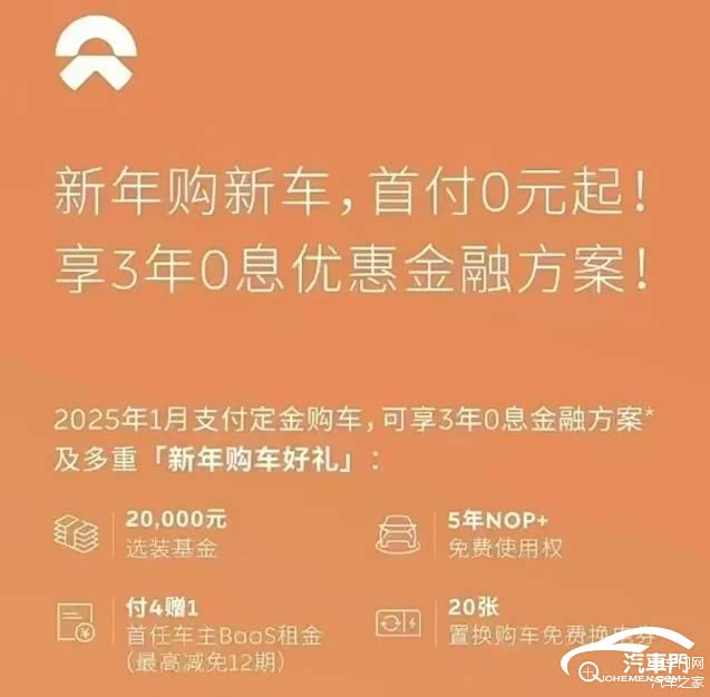 蔚来早在2025年1月1日就曾推出过三年免息叠加选装基金等多种优惠政策,蔚来也尝到了优惠政策带来的甜头,1月蔚来的销量达到13863辆,同比增长了37.9%。在春节假期刚刚结束的节点上,蔚来迫不及待推出了更大力度的优惠政策。自2月1日至28日支付定金的用户,可享首付20%起、5年0息金融方案,并叠加赠送48张换电券、1万元选装基金及5年NOP+免费使用权。此外,2月28日期间开票购车的用户,如因新车开票日期早于2025年政府置换补贴政策要求时间,导致用户无法申请2025年政府置换补贴的,蔚来还将通过等额积分的形式,进行补贴兜底。