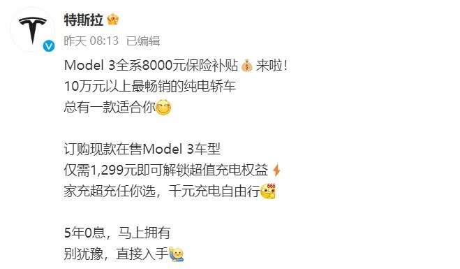 根据特斯拉官网显示,今年2月5日—28日,Model 3全系限时保险补贴8000元,同时能够叠加购车5年0息政策及特享充电权益。对于目前"水涨船高"的新能源车险来说,特斯拉打出的保险补贴"拳",也被大众解读为Model 3限时直降8000元。