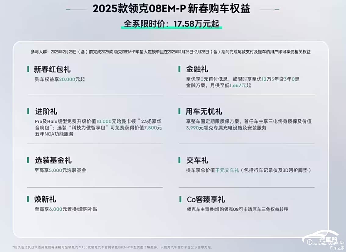 针对领克08EM-P则是推出全系限时价17.58万元起。除享受价格优惠外,购买2025款领克08 EM-P Pro及Halo版型的用户可免费升级价值1万元哈曼卡顿“23扬声器豪华音响包”;选装“科技为傲智享包”可免费获得价值7500元五年NOA功能服务。还有以旧换新增/换购补贴、5000元选装基金、交车礼、0元首付低息金融政策等购车礼遇。