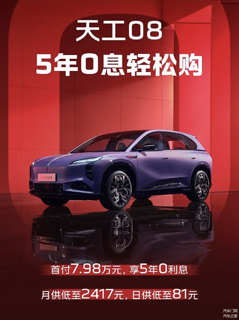 近日,一汽红旗也加入了限时免息大军。天工08首付7.98万可享5年0息政策,月供2417元,日供81元。其次,天工08可享2000元抵17000元新年红包,还可以叠加至高20000元置换补贴。最后还有充电桩免费安装或充电卡券及充电桩抵扣券,终生免费高阶智驾功能等购车福利。