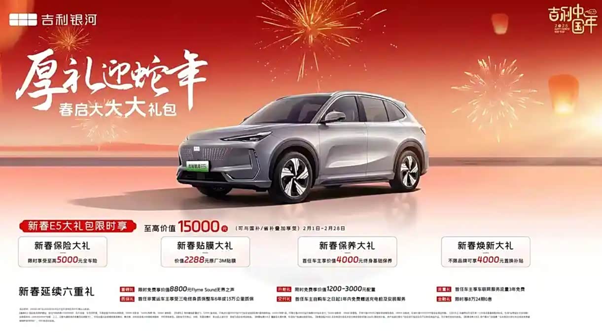 而吉利银河E5则推出了至高1.5万元新春大礼包,其中包含至高5000元全车险的新春保险礼、价值4000元首任车主终身基础保养礼、价值2288元原厂3M贴膜新春贴膜礼和不限品牌4000元置换补贴礼共四重大礼。此外,消费者可限时享8万24期0息等六大购车礼。