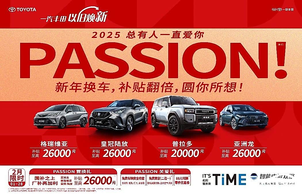 近日,一汽丰田官方推出2月限时置换礼,置换补贴至高26000元,涉及车型包括全新普拉多、2024款格瑞维亚、2024款皇冠陆放和2024款亚洲龙等。