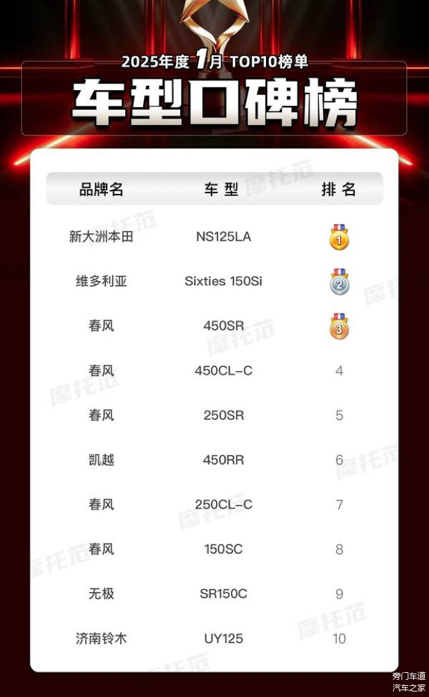 最后看车型口碑榜,新大洲本田NS125LA登顶,看来“小踏板也能有大口碑”这句话没毛病。而春风家族则直接霸榜,450SR、450CL-C、250SR、250CL-C、150SC纷纷上榜,仿佛在说:“我们不仅会造车,还会刷好评。”