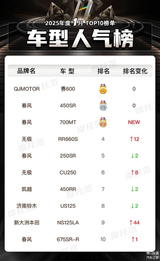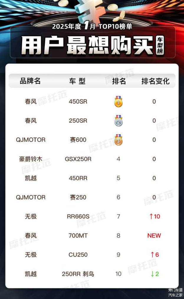 2025年1月的摩托范榜单,看似热闹,实则暗流涌动。春风家族依旧强势,无极RR660S异军突起,QJMOTOR稳中求变,豪爵铃木佛系依旧。不过,榜单背后的真相究竟如何,恐怕只有品牌自己心里清楚。