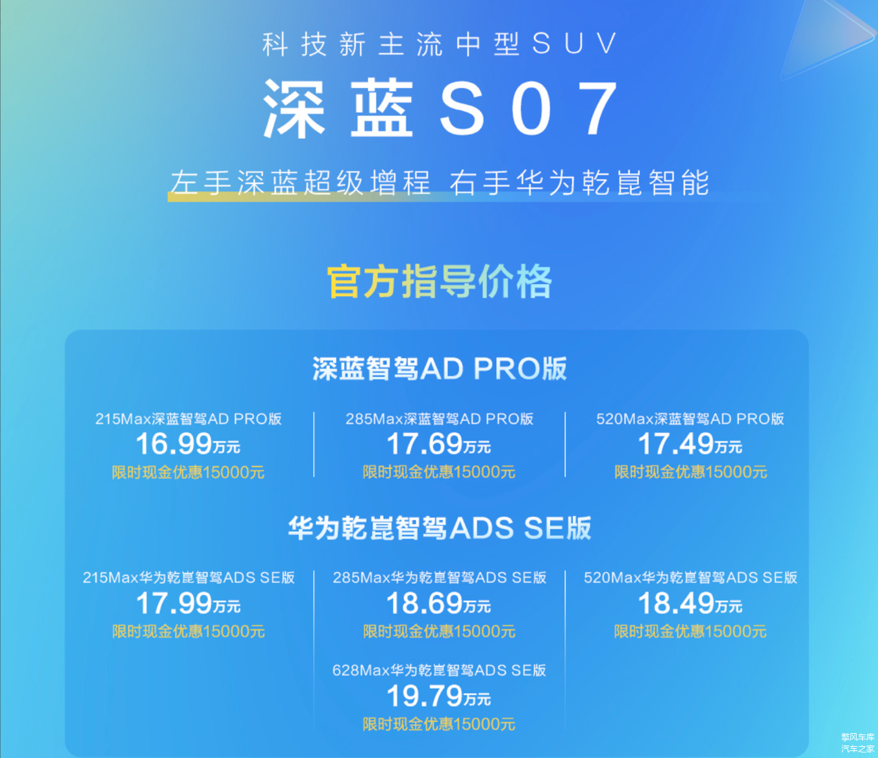 其他方面,新款深蓝S07的增程版,换装了新的1.5L 自然吸气发动机,最大功率为72千瓦,而老款车型则是70千瓦,在纯电续航上,新款深蓝S07的增程版,纯电续航分为215公里和285公里。而纯电车型的话,电机功率为160千瓦或190千瓦,续航里程为520公里或628公里。