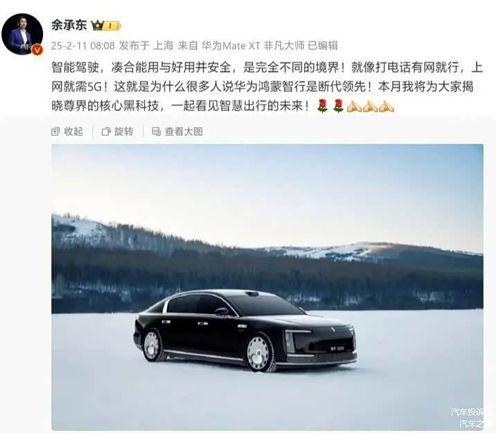 2 月 11 日消息,华为常务董事、终端 BG 董事长、智能汽车解决方案 BU 董事长余承东今日在微博发文称:“智能驾驶,凑合能用与好用并安全,是完全不同的境界!就像打电话有网就行,上网就需 5G!这就是为什么很多人说华为鸿蒙智行是断代领先!本月我将为大家揭晓尊界的核心黑科技,一起看见智慧出行的未来!”这一表态引发了外界对华为智能汽车技术的高度关注。