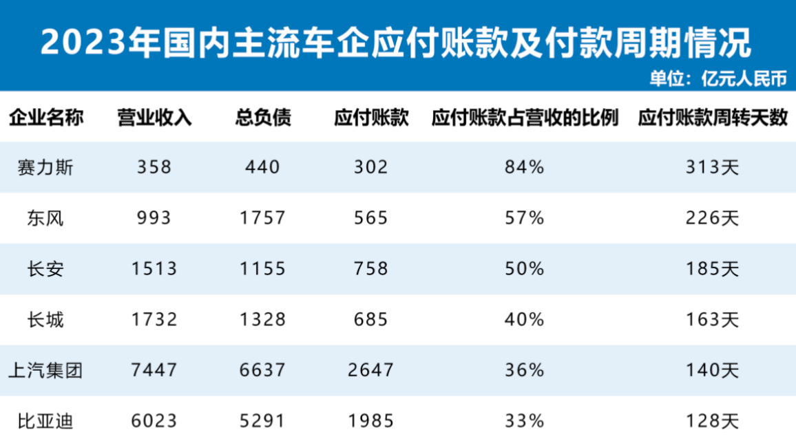 2023年,国内主流车企中,赛力斯应付账款占营收的比例最高,达到84%,这可能与其处于快速发展阶段,采购需求大但资金回笼相对较慢有关;东风集团股份为57%,长安汽车为50%,长城汽车为40%,上汽集团为36%,比亚迪为33%。从这些数据可以看出,比亚迪在应付账款管理方面表现较为出色,能够在实现高营收的同时,有效控制未支付货款的比例。这得益于比亚迪完善的供应链管理体系,通过优化采购流程、加强与供应商的深度合作,实现了应付账款的合理控制,既保障了供应链的稳定,又提升了自身资金使用效率。