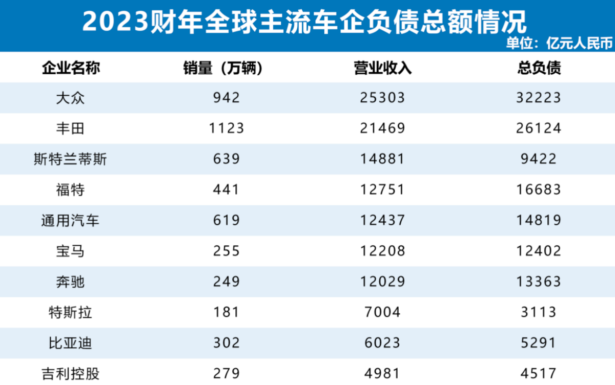 全球头部车企的总负债规模令人咋舌。以2023年为例,大众集团凭借强大的市场布局,实现营业收入2.53万亿元,但总负债高达3.22万亿元;丰田的营收为2.15万亿元,总负债却达到2.61万亿元;通用汽车营收1.48万亿元,总负债也有1.48万亿元。这三家全球汽车巨头的总负债均高于营收,充分彰显了高负债在全球汽车行业的普遍性。除了这三家,斯特兰蒂斯总负债9422亿元、福特总负债1.67万亿元、宝马总负债1.24万亿元、奔驰总负债1.34万亿元,特斯拉总负债3113亿元,这些数据进一步证实了行业的高负债特征。