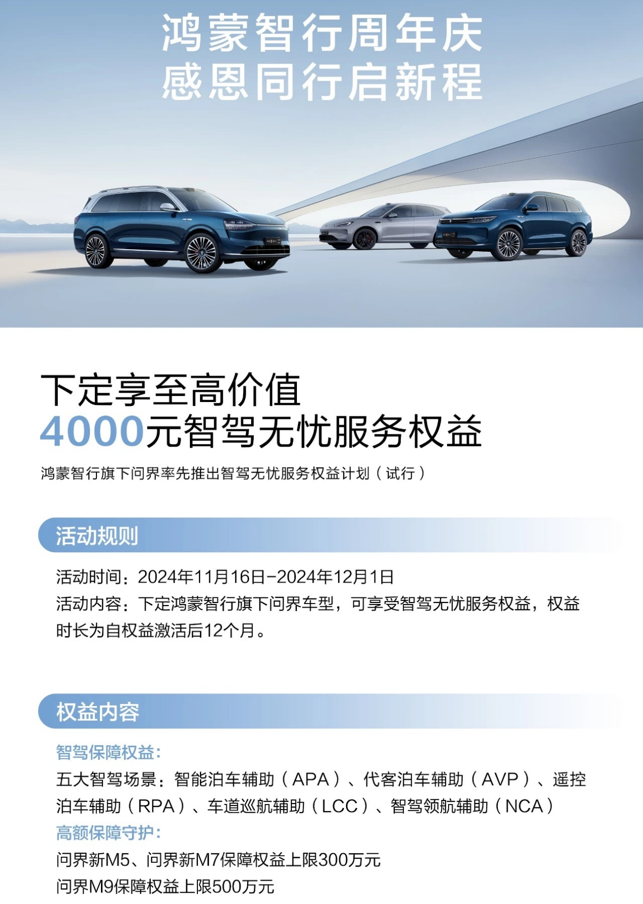 例如,鸿蒙智行智驾无忧服务权益涵盖智能泊车辅助(APA)、代客泊车辅助(AVP)、遥控泊车辅助(RPA)、车道巡航辅助(LCC),与智驾领航辅助(NCA)共五项功能,如果用户在使用上述功能的过程中发生事故,且判定为智能驾驶系统导致的,用户可申请相应赔偿。