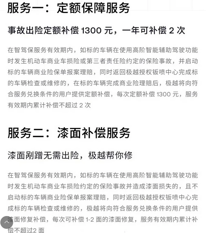 在具体赔偿方式上,各家有所不同。 极越01(图片 | 参数 | 询价)智驾保提供的补偿为,当用户在使用高阶智驾出现商业车损险或三者责任险约定的保险事故后,并启动相应保险理赔,同时返回极越授权钣喷中心维修的,可获得1300元定额补偿,服务有效期内不超过2次。同时,还可补偿1-2面的漆面修复。