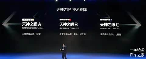 天神之眼B(DiPilot 300):高阶智驾激光版,主要搭载于腾势品牌部分车型以及比亚迪品牌的高端车型,如汉L、唐L等。