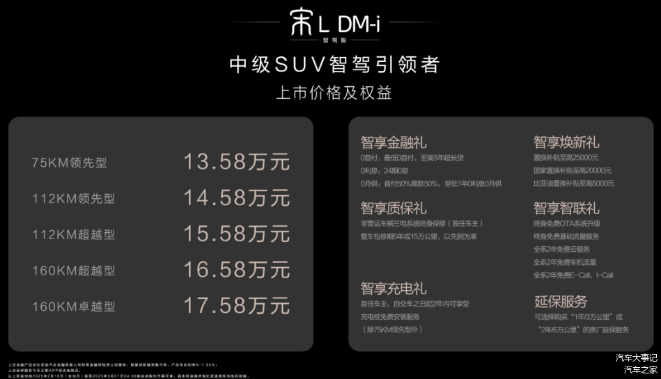 2月10日,随着“天神之眼,开创全民智驾时代”比亚迪智能化战略发布会的举办, 宋L DM-i(图片 | 参数 | 询价)智驾版也正式上市,新车全系搭载天神之眼C–高阶智驾三目版(DiPilot 100),共推出5款车型,官方指导价13.58万-17.58万元。