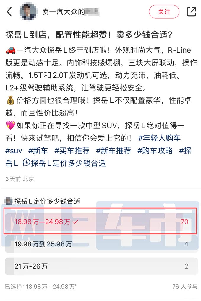有大众销售在社交平台发文,说探岳L到店了!还发起了价格竞猜,给出了3组盲猜价格,其中选18.98万-24.98万的网友最多,这或说明探岳L的最终价格比现款更便宜,是可以被市场接受的。