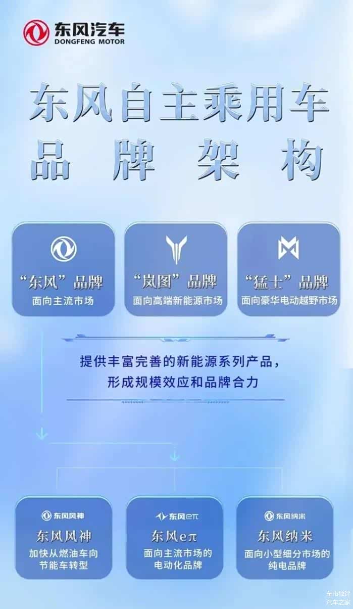 开年伊始,车圈就传出了东风汽车股份与长安汽车合并重组的公告,一时引爆朋友圈。2023年8月东风汽车集团宣布实施东风乘用车新能源“跃迁行动”,旨在对自主乘用车新能源事业进行重大管理体制调整——由集团一体化管理“东风”品牌下东风风神、东风eπ、东风纳米三大产品系列品牌,东风公司领导亲自挂帅,集团总部上阵打仗。此前东风乘用车海外、国内营销由东风公司副总经理、党委常委彭原璞负责,并分管岚图汽车和猛士科技;东风公司原党委常委、副总经理陈昊也曾兼任东风乘用车销售有限公司党委书记、总经理,后改任东风乘用车公司副总经理。