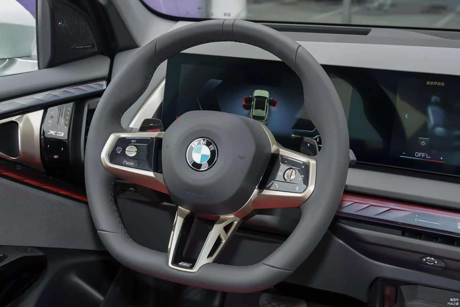 车内的话,全新宝马X3采用了宝马最新的家族化双联屏,由12.3英寸数字仪表和14.9英寸中央触控显示屏组成,内置宝马iDrive 9.0操作系统,支持快速选择、语音识别控制、在线导航等功能。此外,还在中控屏下方、空调出风口、手机无线充电面板等区域加入了和宝马5系相同的氛围灯带,并且门板内衬处呈现出“V”字形轮廓。