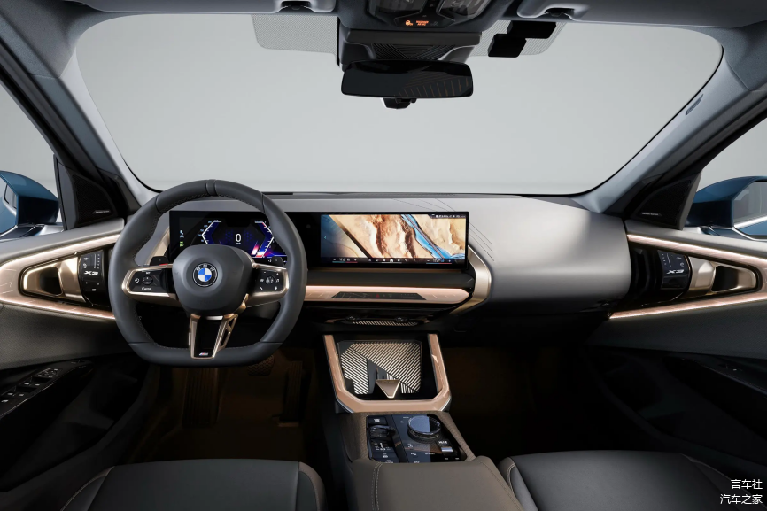 内饰方面,国产全新宝马X3采用了大家非常熟悉的双联屏设计,由12.3英寸的全液晶仪表+14.9英寸的中控屏组成,并搭载iDrive9车机系统。两侧能看到非常显眼的V型氛围灯,而且在中控台和副仪表台上也有氛围灯的布局,增添了不少豪华氛围。此外还有三幅式运动风格方向盘,换挡机构也从鸡腿挡把换成了旋钮式的。
