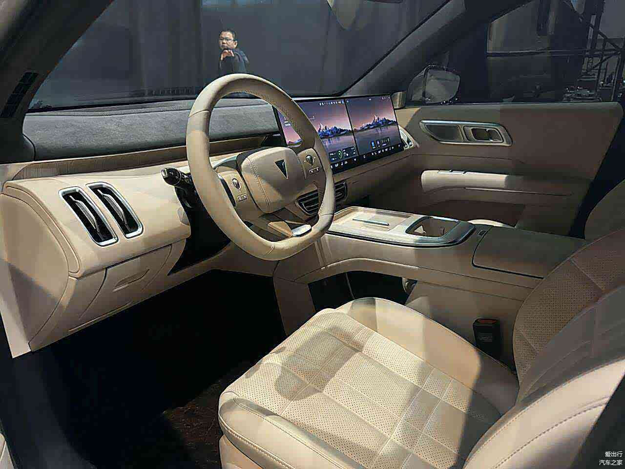 当你走进车里,深蓝S09的内部装饰同样给人一种视觉上的震撼。这款车的中控台设计简洁,配备了一个双15.6英寸的大型联屏(中控屏和副驾娱乐屏)以及一个43英寸的AR-HUD抬头显示系统,为驾驶者创造了一个充满科技氛围的环境。这款新车首次配备了HarmonySpace鸿蒙座舱系统,为乘客提供了更为智能和便捷的驾驶体验。在这款车的浅色内部装饰中,大量使用了皮质和麂皮作为包覆材料,并搭配了木纹装饰板和氛围灯等设计元素,使得车内环境既豪华又温馨。此外,车辆新增了三幅式多功能方向盘、电子怀挡和50W手机的无线充电功能,这些配置进一步增强了车辆的档次和实用性。