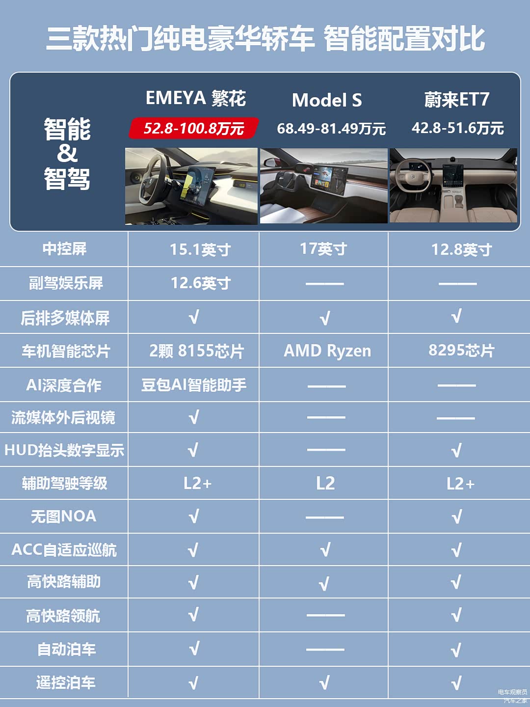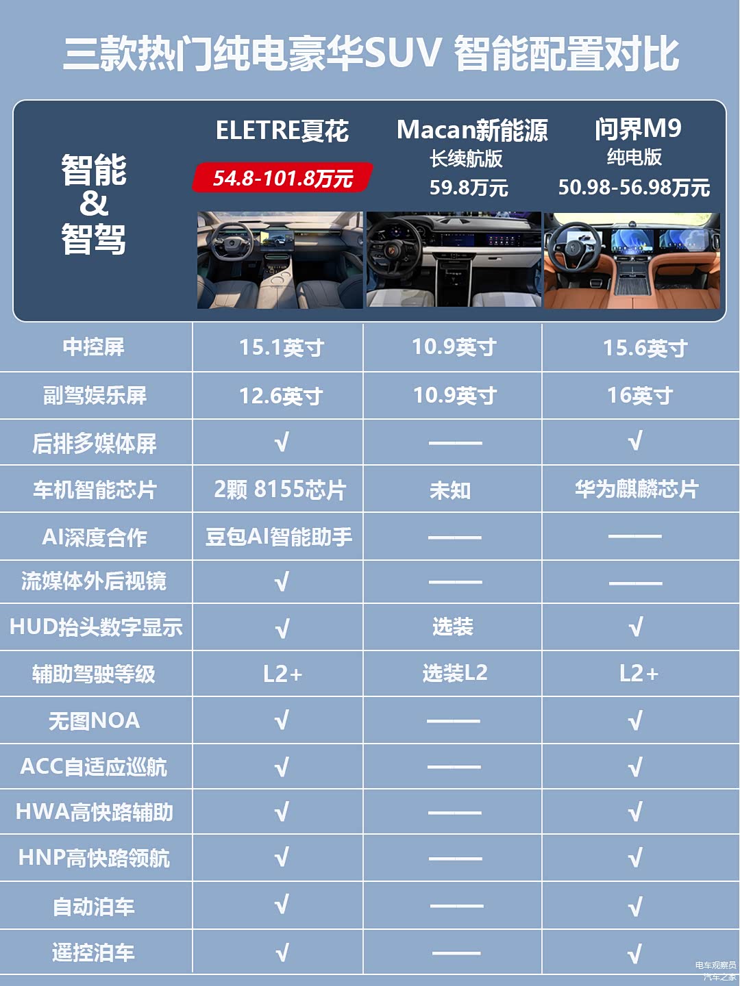 预算50-60w入手豪华电车选性能还是选智能?目前这一高端市场,经典豪华品牌偏向性能,新势力品牌偏向智能,2月14日新款莲花Eletre夏花和Emeya繁花双车上市,价格下探到50W+区间,新车产品力如何?本篇就来对比几款热门竞品。