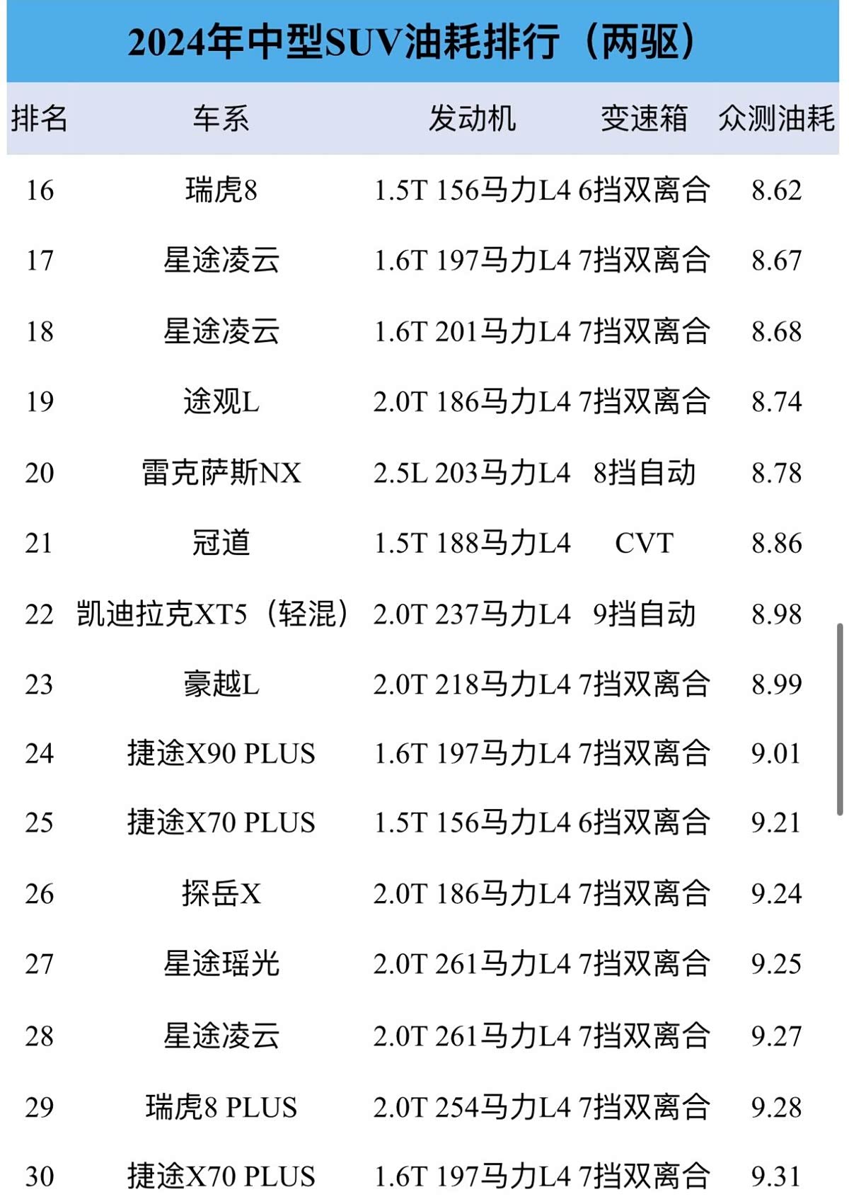 1.6T版本的瑞虎、瑞虎8 PRO以及瑞虎8 PLUS,纷纷闯进了榜单前十,且这三款车型的油耗均未超过8.3L/100km,表现相当出色。此外,探岳、探界者、柯迪亚克以及搭载轻混系统的昂科威,也取得了不错的名次,都属于比较省油的车型。