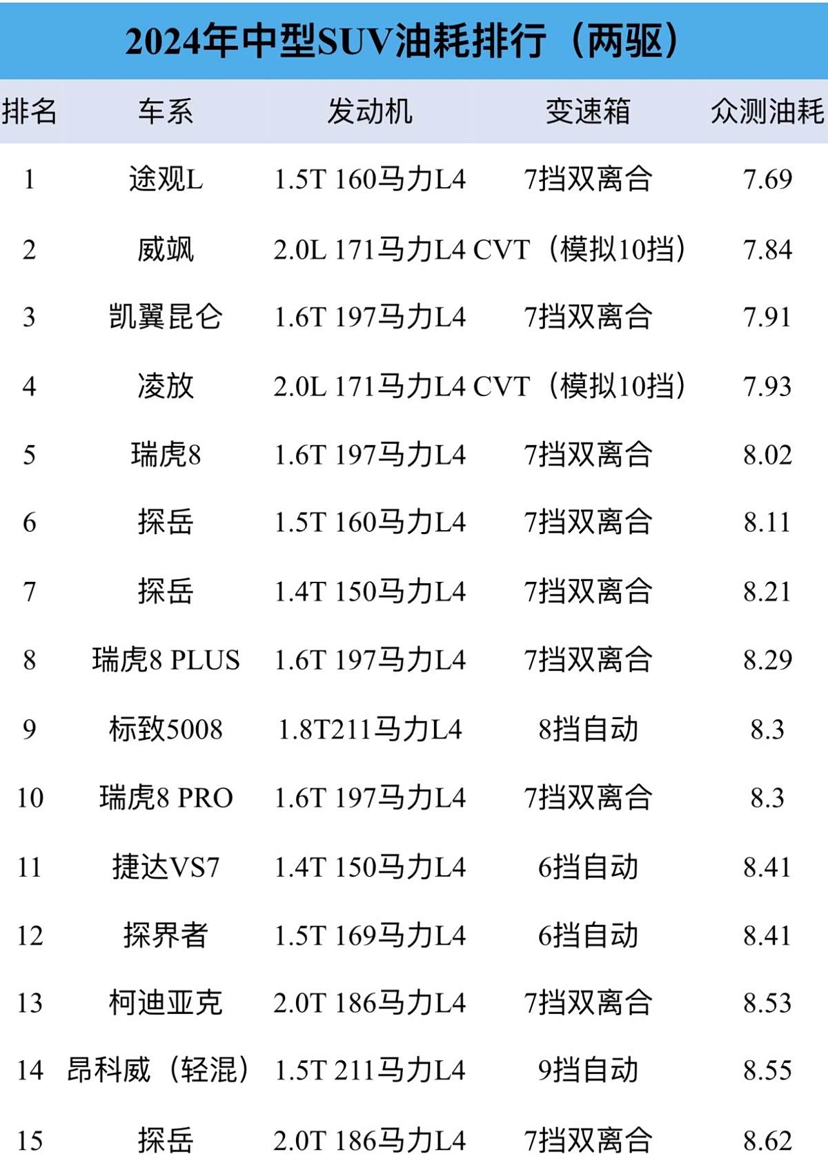 根据车主众测数据,我们整理出了这份2024年度中型SUV油耗排行榜,共涵盖了47款车型。其中,途观L凭借7.69L/100km的油耗表现成功夺得冠军,成为2024年度最省油的中型SUV;威飒以7.84L/100km的成绩紧随其后,斩获亚军宝座; 凯翼昆仑(图片 | 参数 | 询价)位列季军,油耗为7.91L/100km。