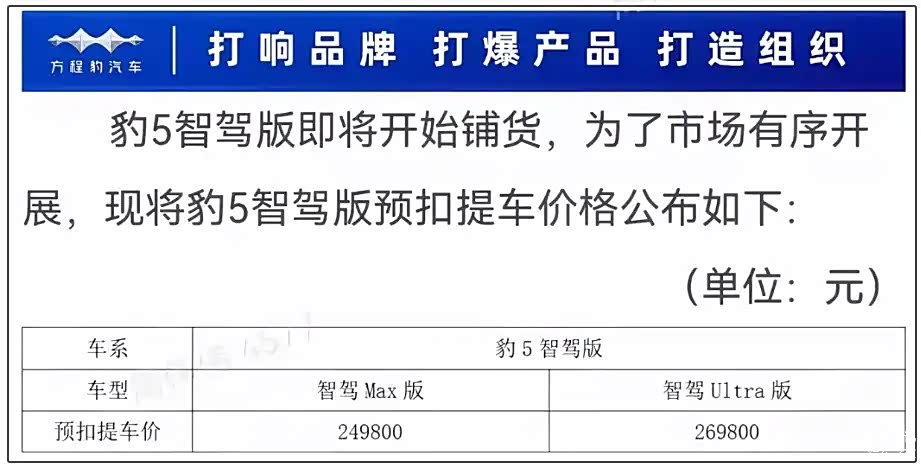 随着比亚迪发布了“全民智驾”这一产品,方程豹 豹5(图片 | 参数 | 询价)智驾版本也随之问世。这款全新的汽车预计将在车顶装配激光雷达系统,并有可能配备与豹8型号一致的华为乾崑智能驾驶ADS 3.0,预期将在3月份正式推向市场。近期,豹5智驾版的预扣提车价格(即经销商从厂家提车价格,正式价格公布后多退少补)被网友公之于众,我们接下来将对此进行更深入的了解。