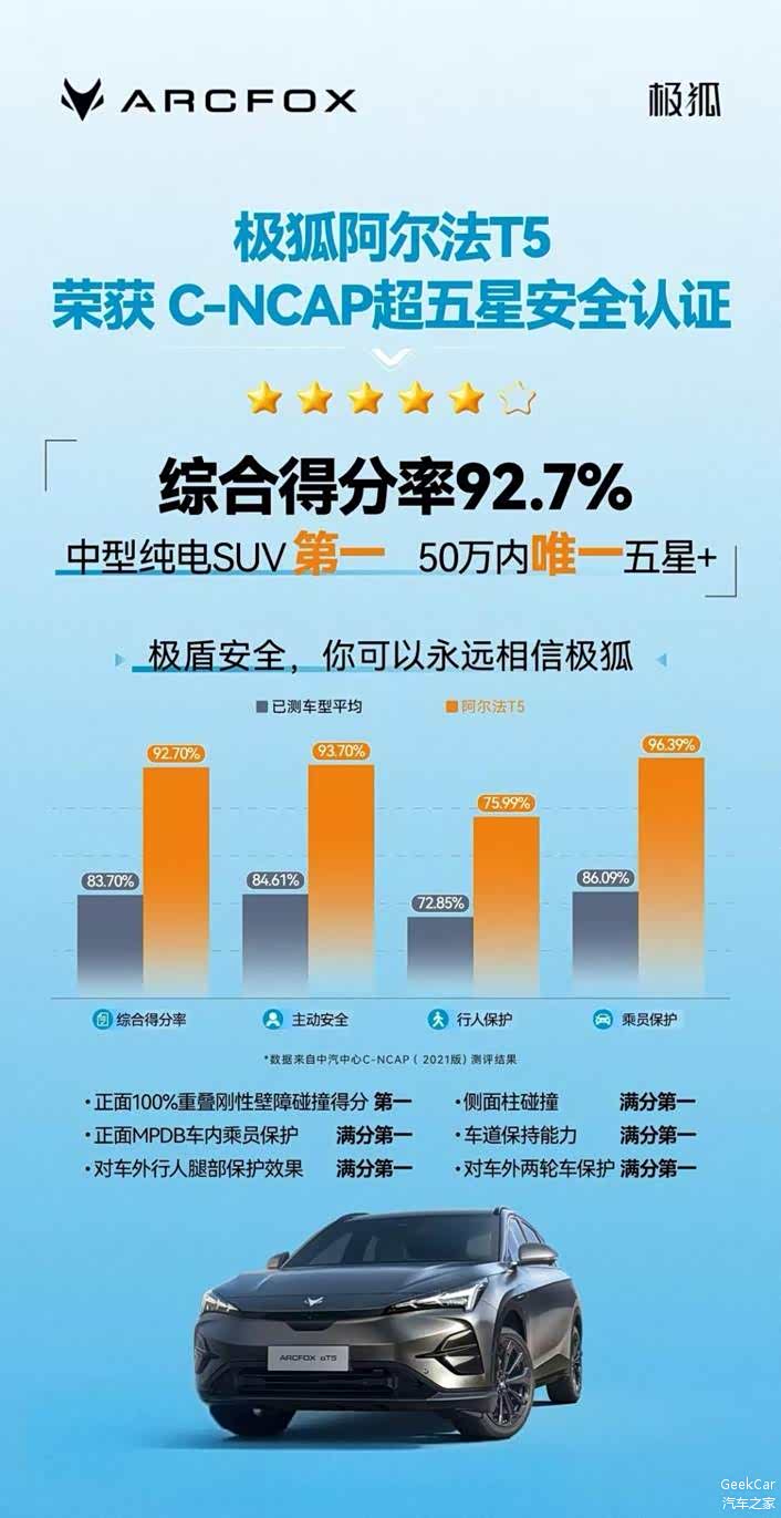 阿尔法T5在中汽研C-NCAP碰撞测试中荣获超五星评价,综合得分率92.7%,不仅是中型纯电SUV的第一,也是50万以内唯一的五星+,以12万不到的价格做到了50万级的安全,成为50万内最安全的纯电SUV,所以被粉丝称为“公路坦克”一点都不为过。