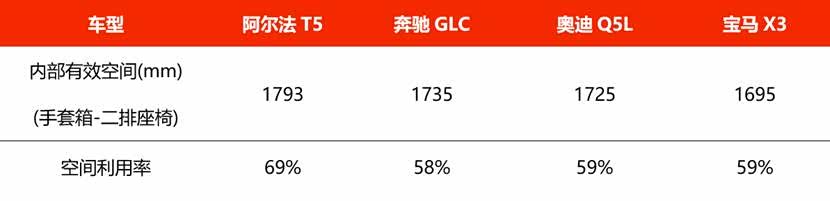 官方降价后的阿尔法T5,用紧凑级车的价格,给你中型车的尺寸,实现了中大级车的越级空间享受。阿尔法T5的轴距达到2845mm,轴长比接近61%,空间利用率达到69%,空间表现是同级第一。还有三组数据值得一提,车内可使用长度1793mm,足可以让后排乘客翘着二郎腿;而车内可用宽度1536mm,三个身材魁梧的“壮汉”也能舒适的在后排落座;而车内空间净高达到1260mm,可以让6岁儿童都可以站在后排。