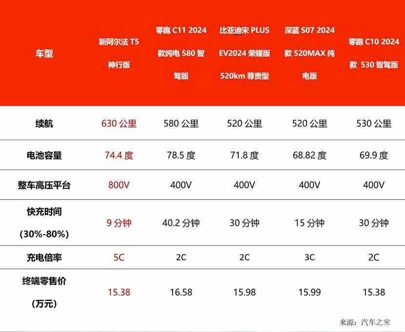 购买纯电车型时,消费者最优先考虑的因素就是续航和充电。毕竟,续航长短和充电快慢直接决定日常用车的便利性和出行的自由度。市面上,续航长、充电快的车有不少,吉利银河E5、深蓝S07、比亚迪宋PLUS EV等都是不错的选择。不过,极狐官方降价后,阿尔法T5神行版“杀出重围”,以15.38万的价格给到同价位最长630公里的CLTC续航里程,这一续航与同级价格相似的产品相比,续航普遍高100公里。更提供了同价位中唯一的800V和5C神行电池的闪充技术。