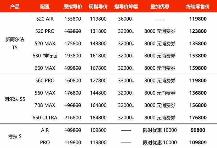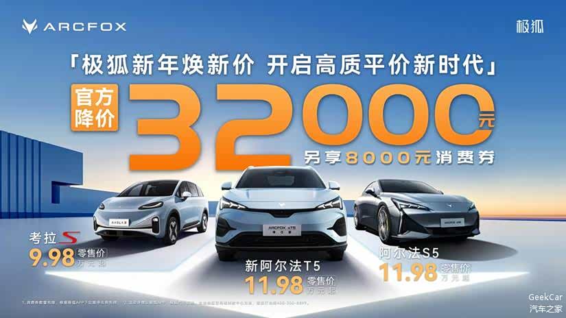 2025年刚开年,新能源车圈就热闹得不得了,多家车企纷纷推出各种降价政策和促销活动,为25开年早早“排兵布局“,有金融贴息的、有保险减免的还有综合补贴的,而在这其中极狐的政策可以说最为炸裂,2月13日极狐汽车宣布“官方降价3.2万元”的重磅消息,同时购车还能叠加8000元消费券。之所以称为炸裂这其中有三,第一就是降幅之最,官方指导价一次性下调超过3万元,降幅达到3.2万以上,这种力度放眼新能源市场同级产品,可以说是力度空前;第二就是政策可叠加使用,本次阿尔法S5和阿尔法T5两款车型在官方降价3.2万的基础上,还可以另享8000元消费券,这里还要划重点敲黑板的一点是,这两个降价方式都是实打实的现金优惠,没有弯弯绕绕套路;第三就是覆盖车型的诚意,本轮降价车型涵盖了极狐主销的阿尔法T5、阿尔法S5、以及 极狐考拉S(图片 | 参数 | 询价),看出极狐本轮降价的诚意。