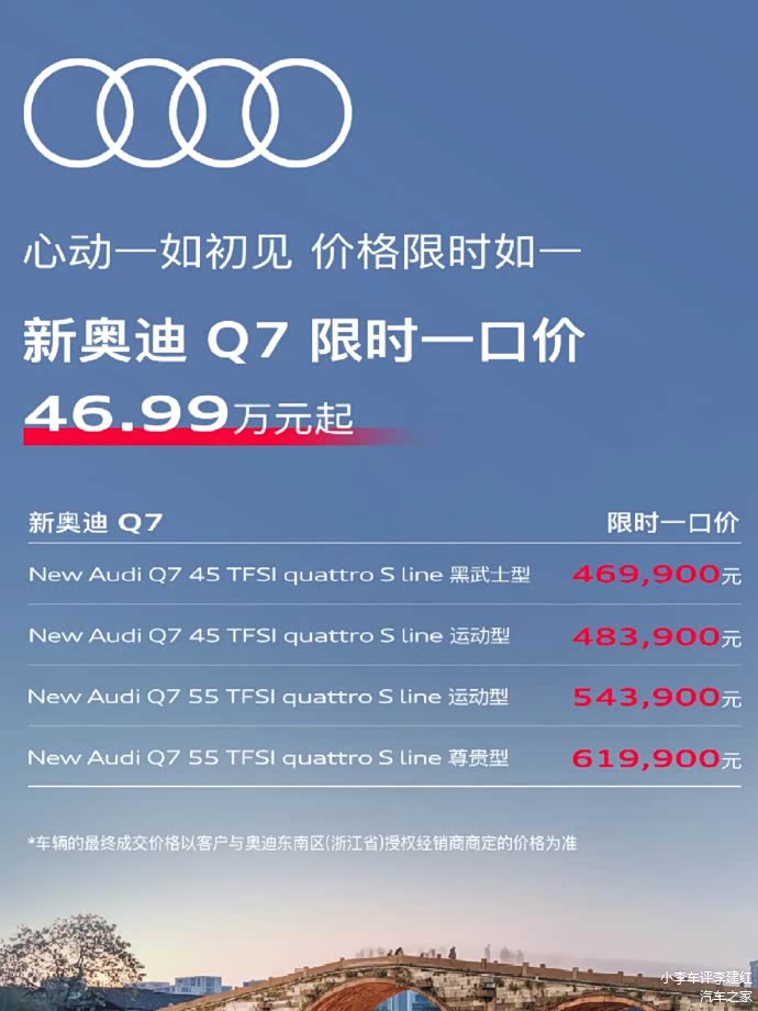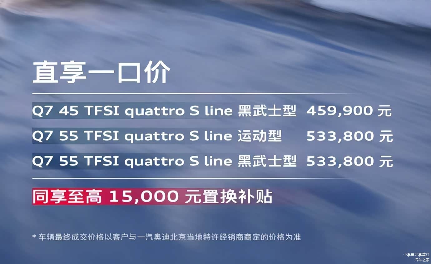 日前,奥迪北京区域和浙江区域先后发布价格海报,Q7的入门价格已经被压到了最低45.99万元的水平,配合1.5万元的置换补贴,相当于最低售价来到了44.49万元的水平,这个价格已经相当于奥迪Q5 2.0T高功率车型的厂商指导价了。虽然相比于60.98万元的起售价,Q7的降价幅度好像并不多,但是从终端起售价来看,44万多的确已经相当低了。