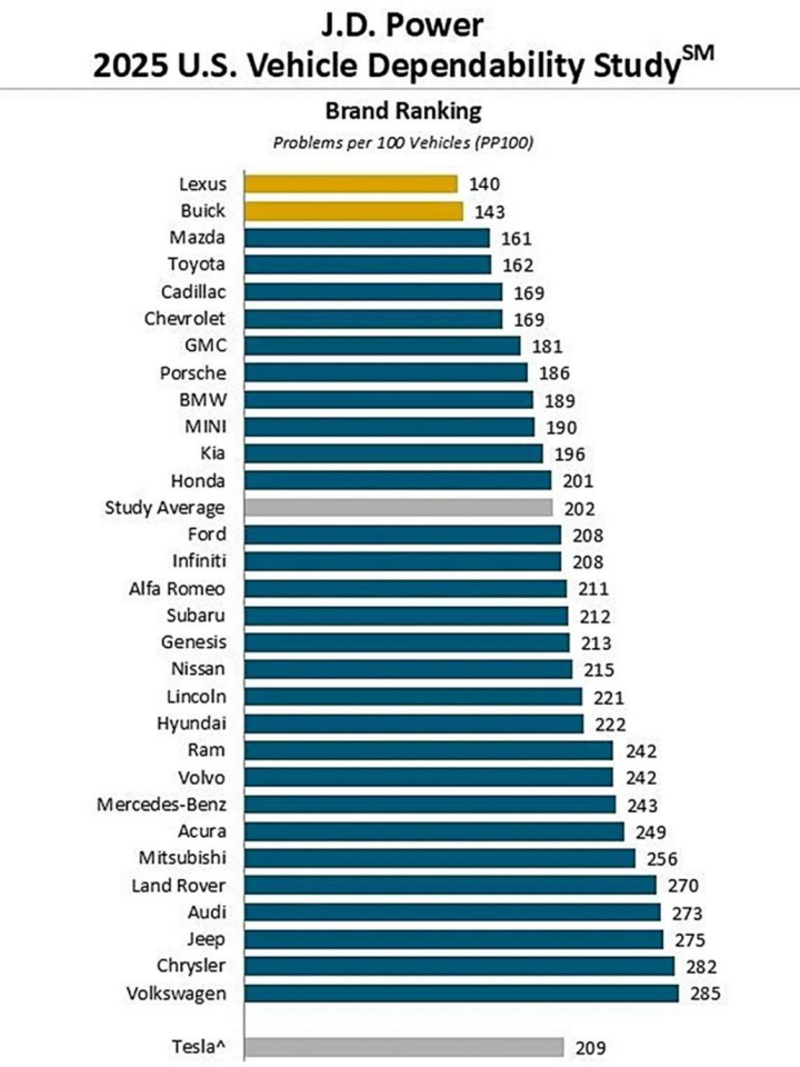 该研究涵盖了 30 个品牌。特斯拉未被纳入研究范围,因为其在一些州不允许获取车主姓名的信息。根据其他地区车主提交的调查结果,特斯拉的得分低于平均水平,每 100 辆车存在 209 个故障问题。