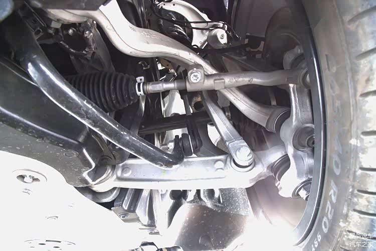后悬架是五连杆式,上下横臂均为钢制,再往里,可以看到里面较短的支臂是铝合金材质。
